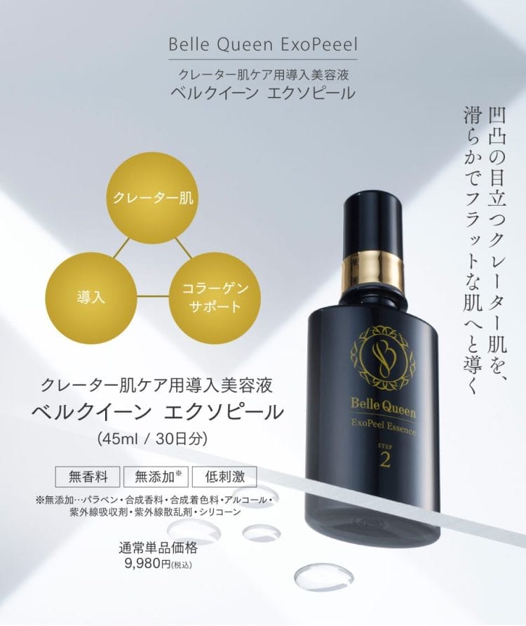 大変申し訳ございませんがベルクイーンエクソピールは、医薬品ではありませんので、クレーターが治るということは申し上げる事が出来ません。 しかし、凹み肌や、おうとつ肌が滑らかになれるように、ベルクイーンエクソピールには独自の成分を詰め込んでいますので、使い続ける事によって、お肌にハリが出て、表面も滑らかになっていくことを実感していただくことはできるかと思います。