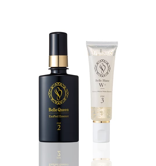 先にベルクイーンエクソピールを使って頂き、その後ベルブランW+を使って頂きたいと思います。 使用手順は、洗顔→ベルクイーンエクソピール6~7プッシュ→ベルブランW+4~5プッシュ→化粧水→クリームという順番になります。