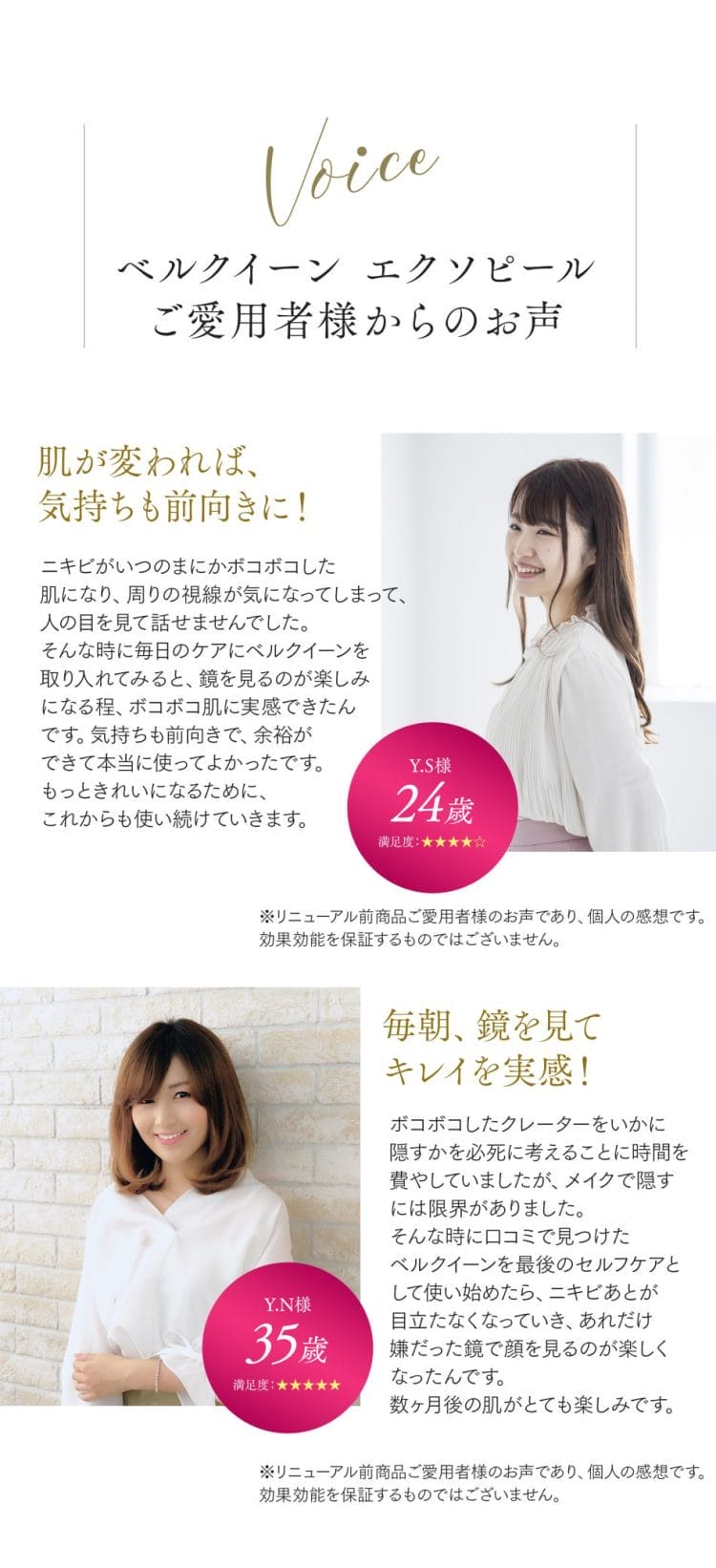 もちろん、ベルクイーンエクソピールだけでのお手入れでも可能です。 しかし、ニキビができやすいお肌、もしくはお肌が少しまだ乱れがちという方は、ベルブランW+とベルクイーンエクソピールの両方でケアをされることをお勧めします。 ただし、ニキビは一切できず、赤みも一切なく、ただ凹み肌をなんとかしたい!という場合は、ベルクイーンのみのお手入れでも可能です。