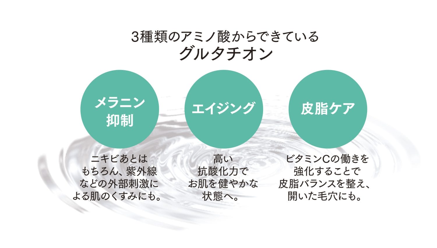 ビタミン類は酸化しやすく効力を失いやすいのですが、グルタチオンがビタミンのサビを防ぎ、さらには還元してくれるので新鮮なビタミンCに戻して働きを強化し、 活性酸素のケアをします。皮脂分泌を抑え、ニキビができにくい肌へ。