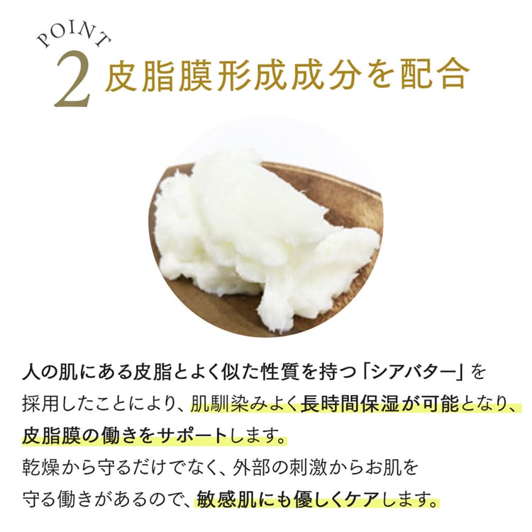 人の肌にある皮脂とよく似た性質を持つ「シアバター」を採用したことにより、肌馴染みよく長時間保湿が可能となり、 皮脂膜の働きをサポートします。乾燥から守るだけでなく、外部の刺激からお肌を守る働きがあるので、敏感肌にも優しくケアします。