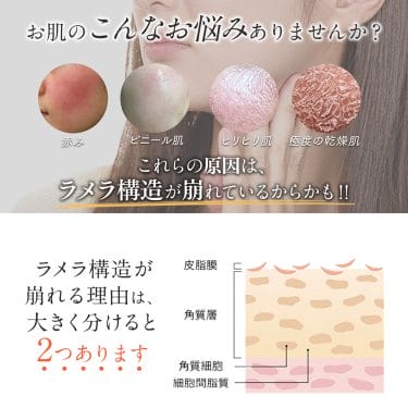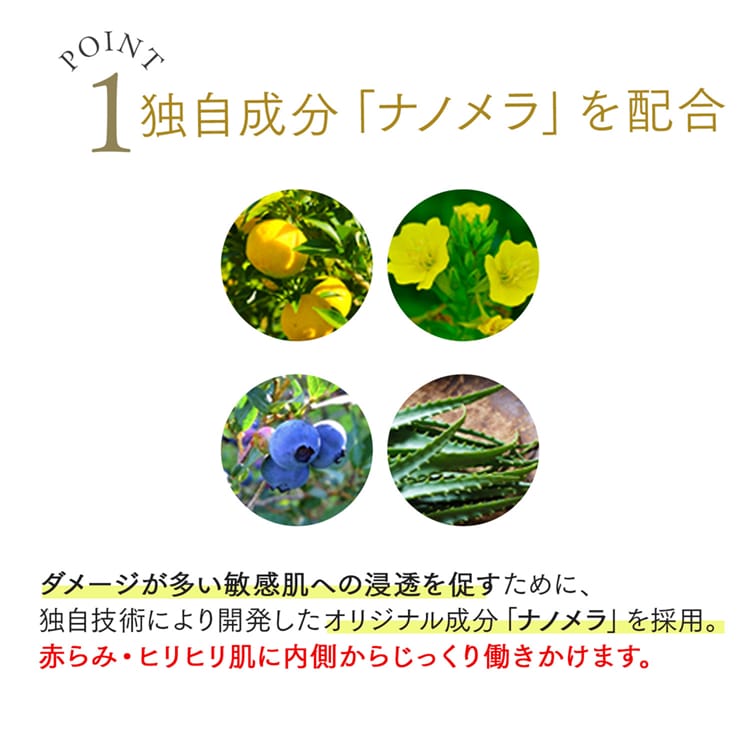 ダメージが多い敏感肌への浸透を促すために、独自技術により開発したオリジナル成分「ナノメラ」を採用。赤らみ・ヒリヒリ肌に内側からじっくり働きかけます。