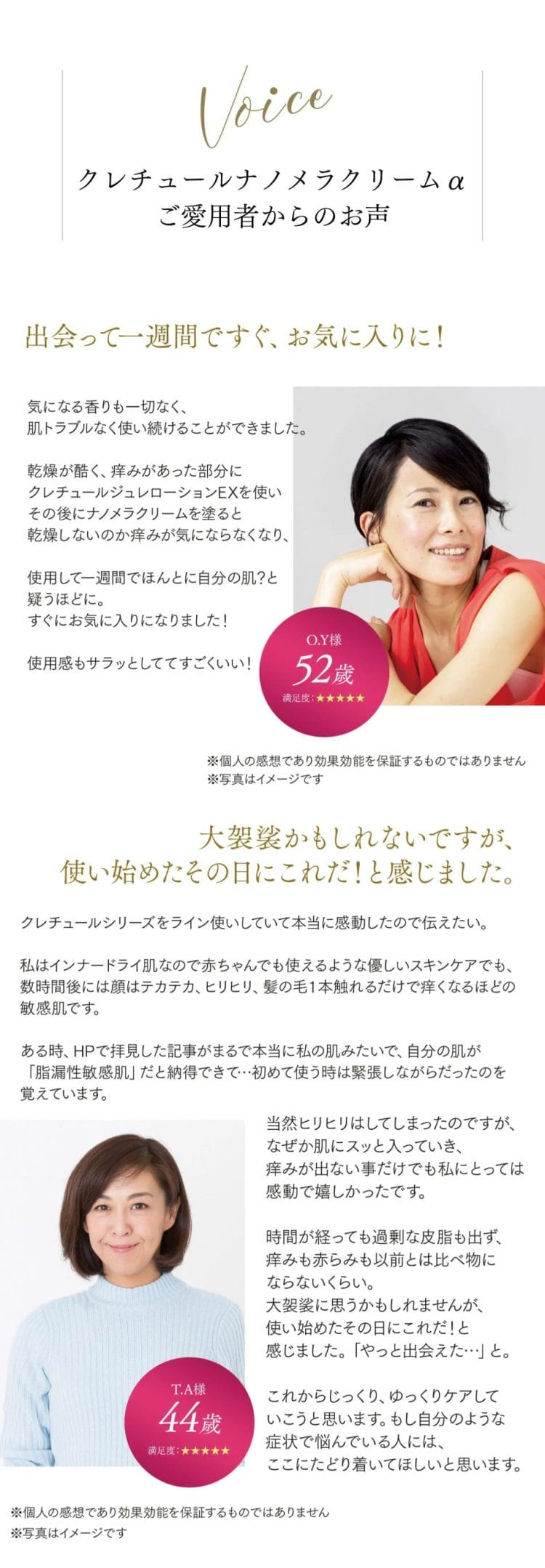 クレチュールジュレローションEX(化粧水)の後、ナノメラクリームαを小豆大を手に取り、お顔全体に馴染ませて下さい。