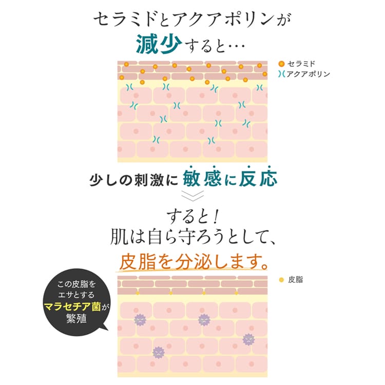 ベタつくのにカサつきも気になるアンバランスな肌に独自成分の「ナノメラ」と「皮脂膜生成サポート」でダメージを受けやすい脂漏性敏感肌を立て直します。脂漏性敏感肌は皮脂の分泌バランスが崩れ ることで、第一バリア機能と呼ばれる皮脂膜が弱まり乾燥する事が原因で引き起こされます。ナノメラクリームαは、弱った皮脂膜の形成サポートをすると同時に、赤らみや痒みなどの肌トラブルへも働きかけ、肌ストレスから守ります。ベタつかず肌に馴染むようにこだわり抜いた成分が、肌の柔軟性を取り戻し、弱っている肌を健康的な状態へ導きます。