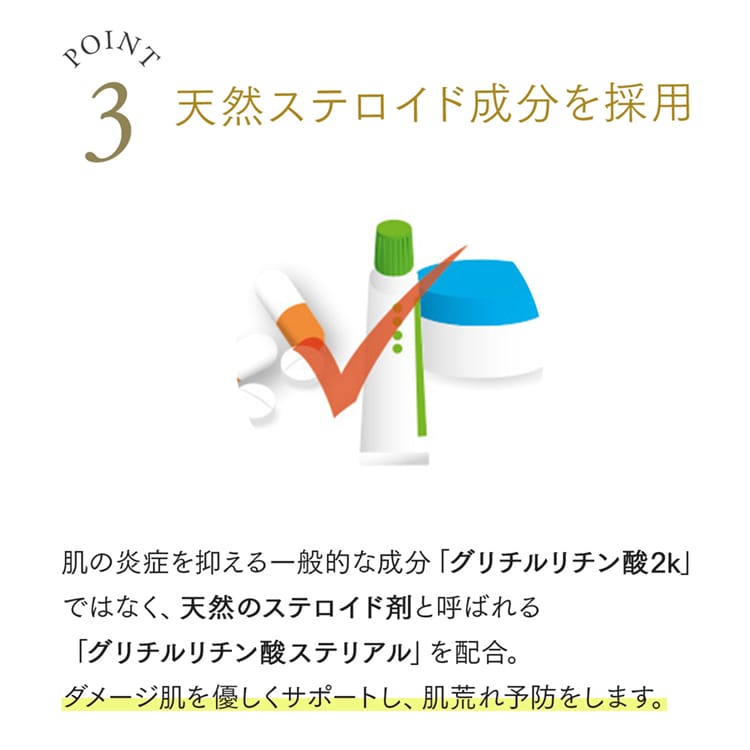 肌の炎症を抑える一般的な成分「グリチルレチン酸2K」ではなく、敏感肌の方にもお使い頂けるように「グリチルレチン酸ステアリル」を配合。この成分は、甘草根エキスから摂れる天然成分のステロイド剤と言われるほどで、 ダメージを受けている肌へ優しくサポートし、肌荒れ予防をします。