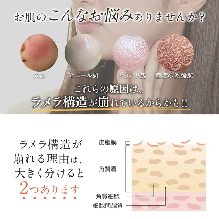 瞬発型セラミドと増殖型セラミドの2種類のセラミドを取り入れたオリジナルセラミド「ナノミド」を独自開発。 肌の水分量を保ち、紫外線などの外的刺激から肌を保護するラメラ構造を整え、バリア機能をサポート。敏感肌による 赤らみ・ヒリつき・痒みを徹底的ケア。