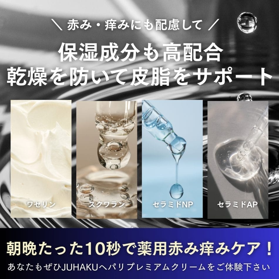 乾燥による肌荒れに効果的な「ヘパリン類似物質」や「グリチルリチン酸2K」の2種類の医薬部外成分を配合。脂漏性敏感肌を防ぎ、赤み痒みのない健康的な肌へと導きます。