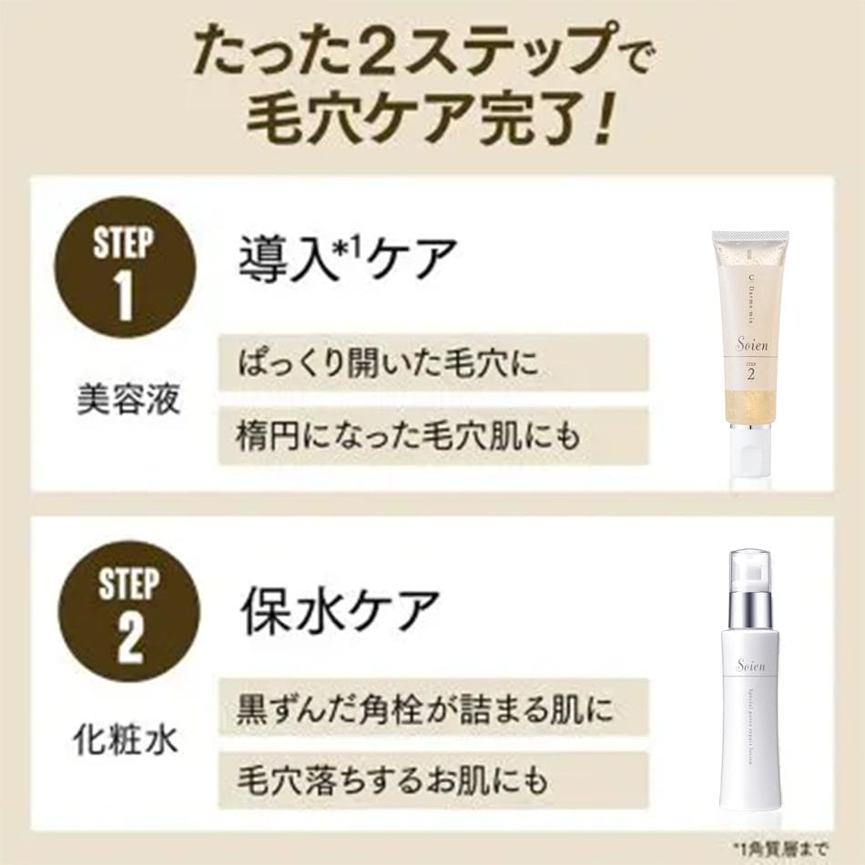 毛穴トラブルをケア*1するソワンシリーズ。「毛穴がある肌の開き・黒ずみ」にアプローチして毛穴レス肌に導く2点セットです。ソワンCダーマミックスに配合のオリジナルビタミンカプセル「Cダーマミックス」には、肌にハリと弾力を与えるアーティチョーク葉エキス、メラニンの生成を防ぐグルタチオン、保湿成分のセラミドをに凝縮しました。EPS SEAMAT*2を採用により、皮脂テカり防止も叶えてメイクノリもUPします。ソワンポアリペアローションに配合の「ビタミンC誘導体」が肌への浸透*3性を高めながら活性酸素ケアを行い、黒ずみ*4やザラつきのないキメ整うツヤ肌へ導きます。
