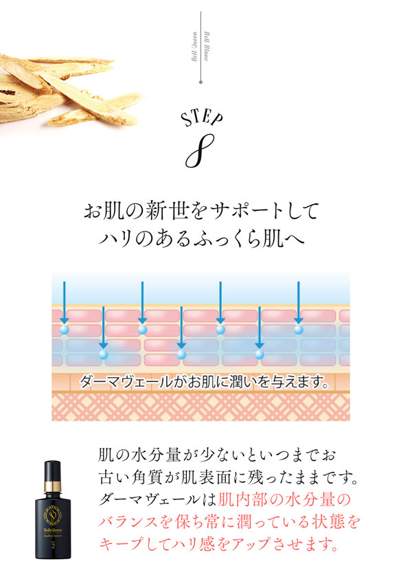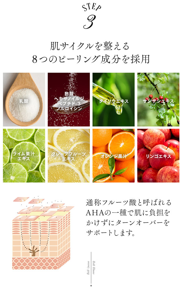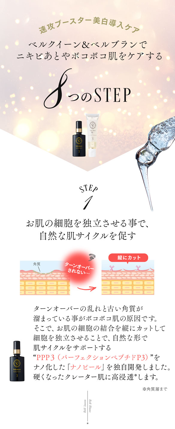 ベルクイーンエクソピールは、パーフェクションペプチドP3という硬くなったお肌の各層を緩め、肌サイクルしやすいお肌作りをしてくれる成分をナノ化した「ナノピール」を高濃度に配合しています。凹み肌や、でこぼこお肌というのは、通常のお肌に比べて、硬く、ゴワゴワになってしまっている傾向があります。 この硬くなったお肌を和らげ、またゴワゴワ肌も滑らかにすることによって、お肌がどんどん柔らかくなって滑らかになっていく事を実感できる成分です。 また、その他にも、肌再生に着目した最新美容成分や8つのピーリング成分が肌に負担をかけずにターンオーバーをサポートしてくれるのでお肌の質感自体にも実感していただけるようになっています。