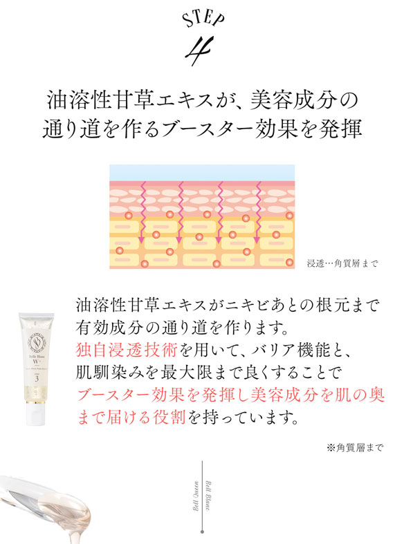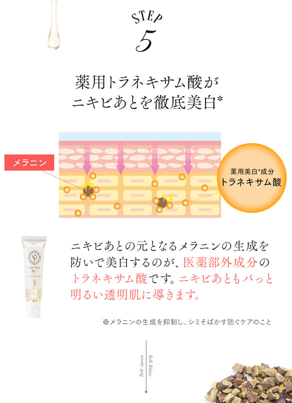 ベルブランW+は、ニキビ予防とニキビあとのメラニン生成を抑えシミを防ぐ効果があります。荒れたお肌を整えながら透明感あるお肌にしてくれる美容液です。 ベルクイーンエクソピールは凹凸クレーター肌のお肌を柔らかくしながら、滑らかに整える効果があります。凹凸クレーター肌専用がベルクイーンエクソピール、ニキビと赤らみやシミ専用がベルブランW+ということになります。