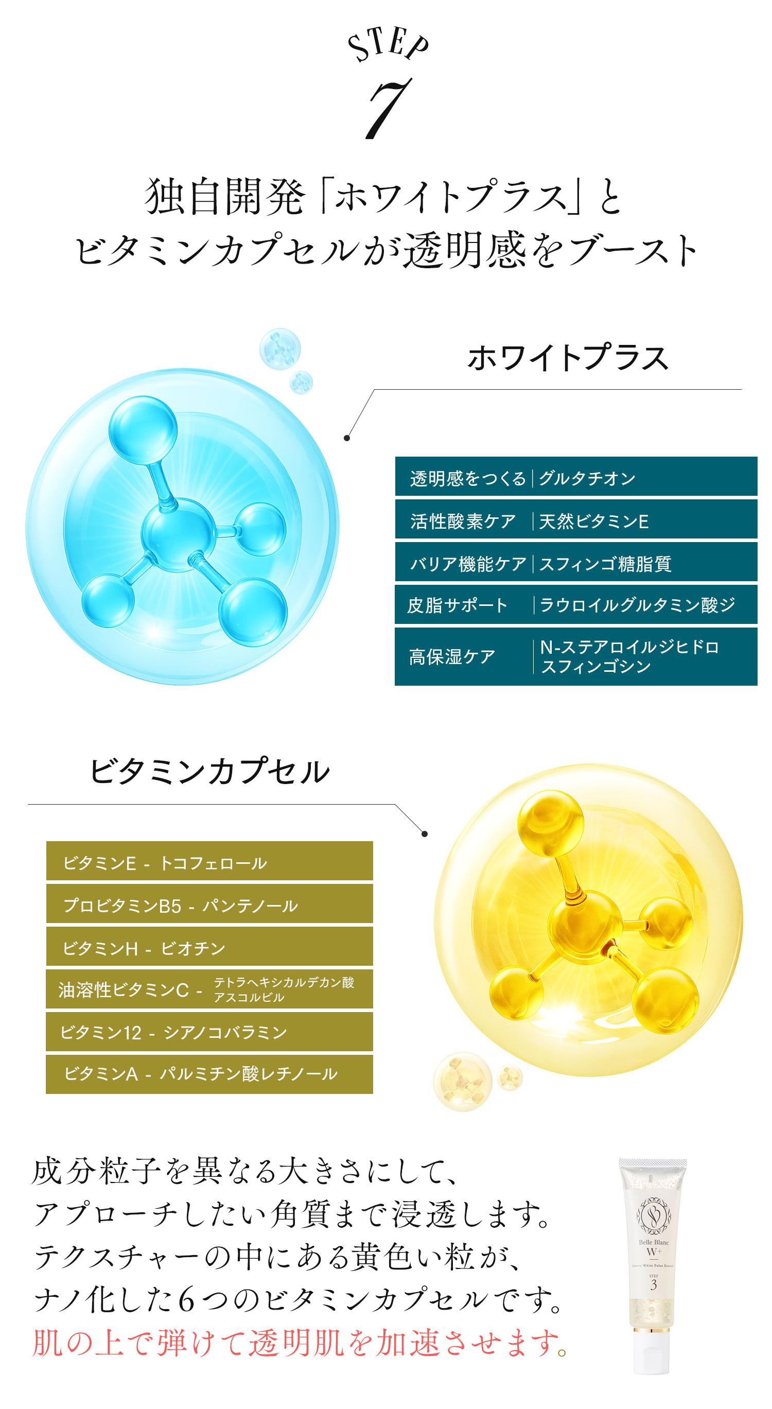 グルタチオン、オウバクエキス、天然ビタミンE、エクトイン、3-O-エチルアスコルビン酸、ニコチン酸アミド、牡丹エキス、結晶セルロース、アルギニン、エチルセルロース、水添大豆リン脂質、黄酸化Fe、ラウロイルグルタミン酸ジ(フィトステリル・オクチルドデシル)、スフィンゴ糖脂質、ベヘニルアルコール、オウゴンエキス、ペンタステアリン酸デカグリセリル、ステアロイル乳酸Na、ステアロイルフィトスフィンゴシン、イソステアリン酸フィトステリル、アーティチョークエキス、シソエキス-1、ゼニアオイエキス、ヒドロキシステアリルフィトスフィンゴシン、カンゾウ葉エキス、パンクラチウムマリチムムエキス、N-ステアロイルジヒドロスフィンゴシン、テトラへキシルデカン酸アスコルビル、ビタミンH、D-パントテニルアルコール、ビタミンAパルミチン酸エステル、ラッカセイ油、シアノコバラミン、ヒドロキシエチルセルロース、キサンタンガム、D-マンニット、カルボキシビニルポリマー、BG、1,2-ペンタンジオール、濃グリセリン、POE硬化ヒマシ油、フェノキシエタノール