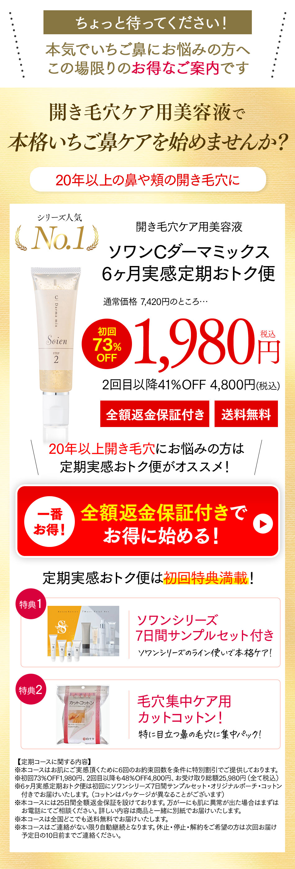 ソワンシリーズは、低刺激にこだわって成分を配合しています。肌への刺激が強い防腐剤を使用せず、刺激の少ないフェノキシエタノールを採用しております。現在、サンプルのみのセットと本品のセットのご用意があり、本品のセットには、サンプルセットと全額返金保証が付いておりますので安心してお試しいただけます。肌への異常がでなければ、スムーズにケアを継続することが可能です。