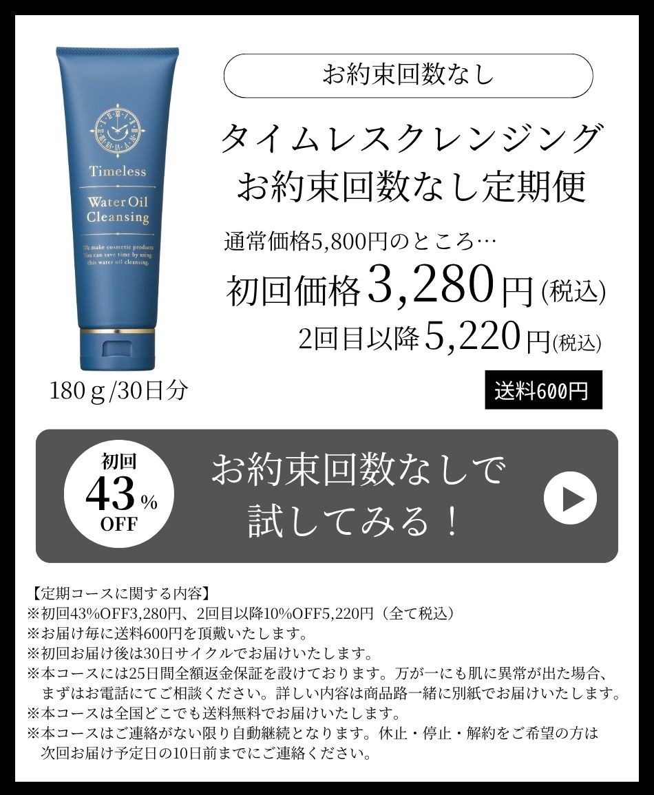 本来ダブル洗顔とは、クレンジングでは落とす事のできない皮脂汚れや古い角質汚れを落とすために必要です。 しかし、タイムレスウォーターオイルクレンジングはウォーターホールド処方によって低刺激でありながら、 優れた洗浄力を持ち合わせているためしっかりメイク汚れ、皮脂汚れを落とすことができます。 タイムレスウォーターオイルクレンジングの後に洗顔料を使用しても問題はありませんが、 刺激の強い洗顔料をご使用になりますと過剰洗顔の恐れがありますので敏感肌の方はお気を付けください。